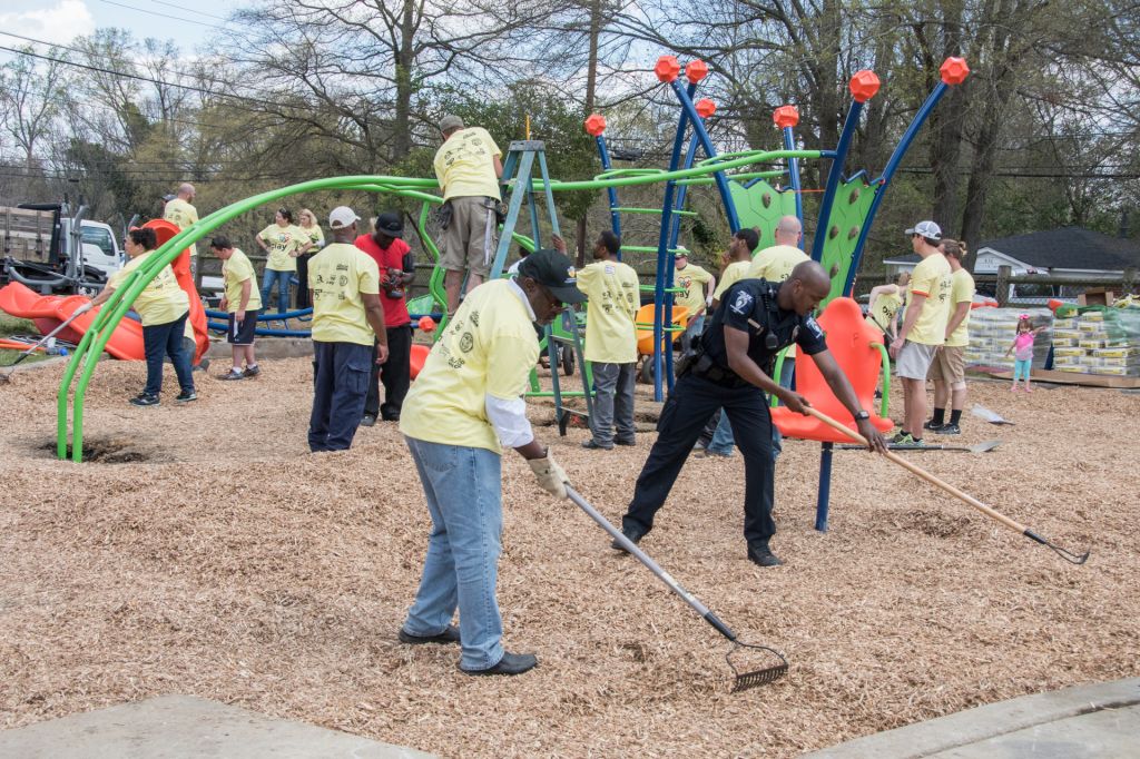 On Wednesday, March 29, 2017 county residents, youth and local leaders joined Mecklenburg County Park and Recreation, Charlotte-Mecklenburg Police Department Metro Division, and Cunningham Recreation for the second Healing Communities Through Play™ playground build at Druid Hills Park located in Charlotte, North Carolina. More than 100 volunteers worked together; police, youth and residents side by side, to build a playground. The playground build provided the opportunity for local residents and law enforcement an opportunity to find a common goal for the betterment of the community. Area teens interacted with local officers on the new fitness equipment while the younger children enjoyed the K-9 Unit. A brief ceremony took place with local leaders addressing community members and volunteers, the local school provided entertainment with children playing "beat buckets," and lunch was served. The play project was completed within the day in an area that was in great need of a place for children and their families to come and play and be active outdoors.