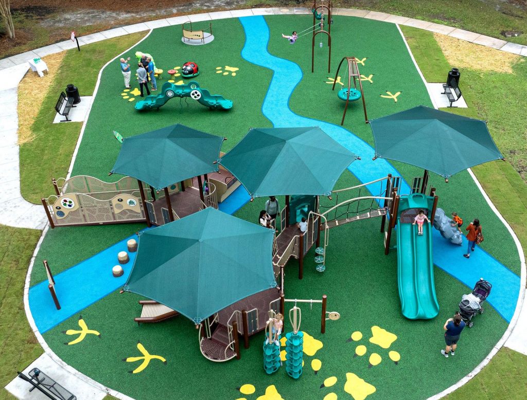 They named the playground Play For All and it has several features that make it inclusive, starting with the unitary accessible turf safety surfacing and accessible ramps throughout the playground structure. There is an inclusive seesaw and zip track with an adaptive seat. Along the perimeter of the playground there are freestanding musical play components that are inclusive and allow for intergenerational play.