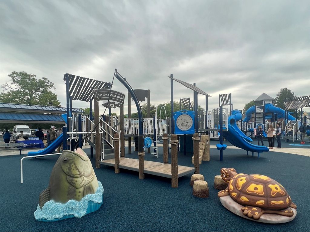 The playground uses many nautical themed elements including fishing rod, box turtle, dock themed posts that look and feel like real wood, as well as GFRC (glass fiber reinforced concrete) bass head climber, catfish climber, tackle box climber, and Dayton tackle sign. The play area has exciting freestanding play elements including the Sky Run Zip Track and Skyline Tower, and nets for various climbing adventures including the VistaRope Race 4 and VistaTree Top. Swings include a Zero G Chair, and custom swing shade with the popular GameTime Expression Swing. Adjacent to the play space is a Thrive 450 outdoor gym to include a place for adult outdoor fitness, and the area is completed with a 20’ x 34’ steel gable shelter, picnic tables, benches and poured-in-place (PIP) safety surfacing with BCBS logo graphics.