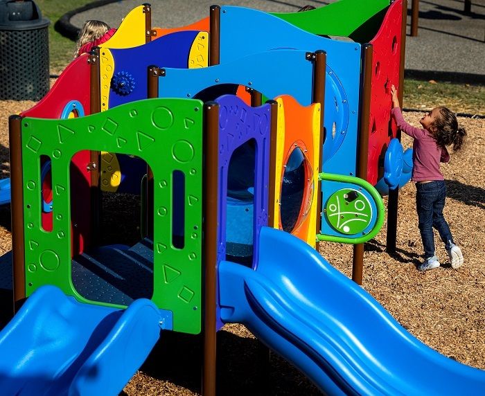 For this age group, we recommend safe, low-height equipment like balance beams at ground level, small slides, and short climbing structures. GameTime offers equipment for early childhood, such as the ECHO Toddler play system with interactive games, the Small Feats system with shapes and numbers, and the Little Steps system that even has a crawl tube for exploration.