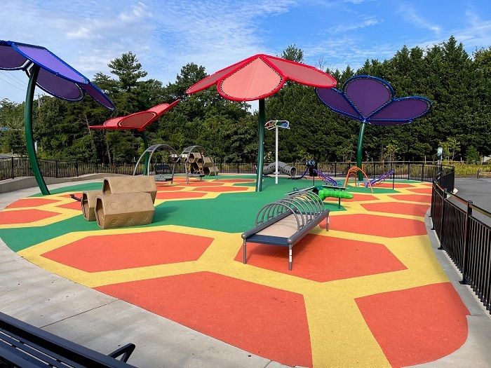 Situated on 2.5 beautiful acres, the Harbor Drive Wellness Park includes the county's first fully accessible playground, meadows, a pollinator garden and a looped walking trail. The project includes custom freestanding flower shades, play equipment featuring honeycomb climbers, roller table, caterpillar climber, butterfly climber, dragonfly seesaw, arch saucer swings and custom honeycomb pattern poured-in-place safety surfacing. The play area is nicely fenced with the wellness area outside to include several fitness stations.