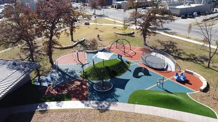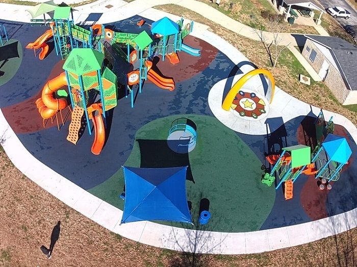 McCauley Park is over 8,500 square feet of inclusive play opportunities! It is a National Demonstration Site for both Play On! and 7 Principals of Inclusive Playground Design. It features custom towers, a custom steel roof over our GT Wave inclusive net climber and Lappset’s YALP Interactive Play! Sona Arch interactive play piece, two separate ramped 5-12 and 2-5 structures, ADA accessible sidewalk surrounding the perimeter of the playground.
