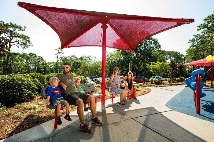 Second, shade structures significantly reduce the temperature of play equipment and surfaces, preventing burns and heat-related discomfort. Third, shaded areas offer a comfortable environment for caregivers and promote longer, more enjoyable play sessions for children. Parks that don’t have adequate shade are typically not a first pick for parents and caregivers. And let’s not forget, shade also extends the life of your play equipment and keeps it looking nicer longer.