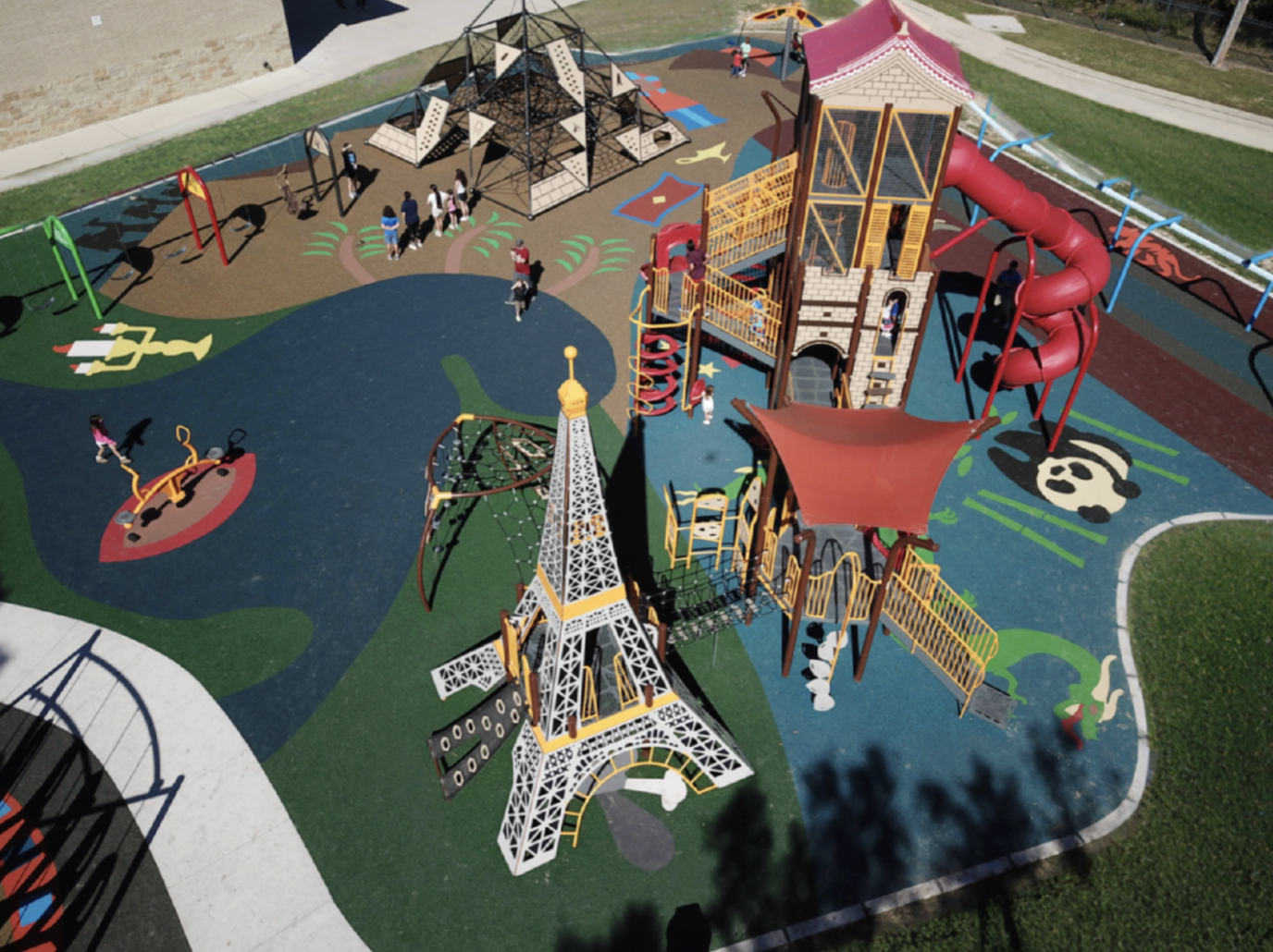 Colorful poured-in-place rubber safety surfacing adds to the excitement with vibrant graphics, camels, pandas, tigers, and ocean creatures that tie the global theme together. The Wonders of the World Playground blends cultural discovery with active play, inspiring curiosity, creativity, and connection as students discover the wonders of the world without ever leaving the schoolyard.